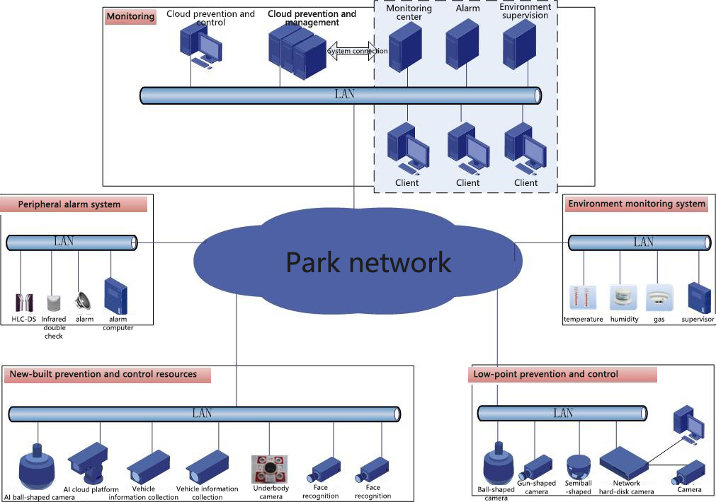 Based on user needs and video application consolidation, advanced technologies are used to enrich front-end acquisition and back-end applications. This design takes high-point monitoring as the core, and through 360-degree large-scale video collection, it forms an all-round coverage of the park, and use advanced augmented reality to expand video-based applications.